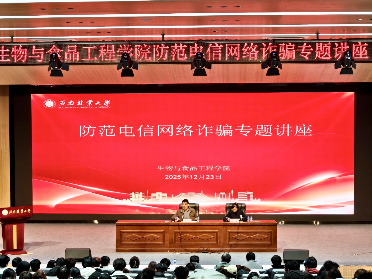 12月23日,生物与食品工程学院邀请生态与环境学院党委副书记王富林老师作防范电信网络诈骗专题讲座,学院全体大一新生和班主任参加讲座。讲座由学院党委副书记陈敏老师主持。王富林老师结合自己的工作经验,通过真实案例,深入剖析了“刷单返利”、“冒充客服”、 虚假投资理财等新型诈骗手法的作案特点,系统讲解了识别与应对诈骗的有效方法。讲座强调,同学们一要提高警惕,筑牢思想防线,充分认识电信网络诈骗的严重危害,克...