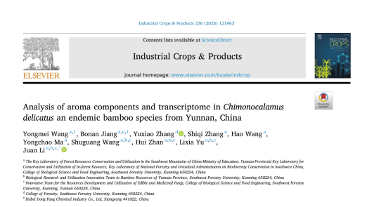 2025年9月,生物与食品工程学院李娟博士课题组在SCI一区TOP 期刊《Industrial Crops & Products》上发表了一篇题为“Analysis of aroma components and transcriptome in Chimonocalamus delicatus an endemic bamboo species from Yunnan, China”的文章,首次系统解析云南特有竹种——香竹的不同秆龄与部位的挥发性物质成分、合成途径及其调控网络,为其香味物质的开发与精油生产奠定理论基础,为香竹资源开发利用提供科学依据。