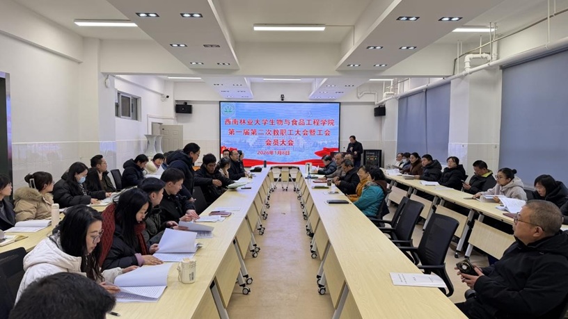 2026年1月8日上午8:40,生物与食品工程学院第一届第二次教职工大会暨工会会员大会在生物楼419会议室隆重召开。校工会组织宣传科科长周泽明老师莅临指导并发表讲话,学院全体教职工参会。