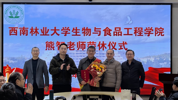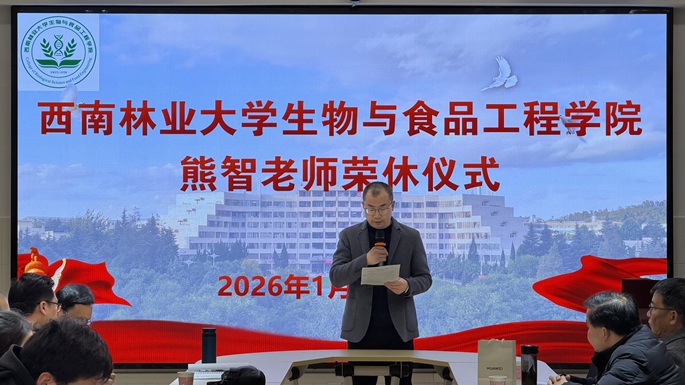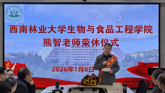 岁月如歌,致敬芳华。2026年1月8日上午,西南林业大学生物与食品工程学院工会在生物楼419会议室隆重举行了熊智老师荣休仪式。校工会领导、学院领导班子、全院教职工及学生代表齐聚一堂,共同见证这一庄重而又充满温情的时刻,向为学院发展倾注心血与智慧的熊智老师致以崇高敬意与诚挚祝福。仪式由学院副院长敖新宇主持。